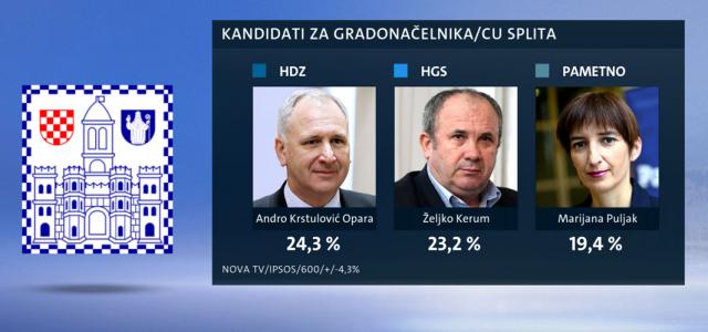 Opara među Splićanima (1. krug) trenutačno uživa 24,3 posto potpore birača, a iza njega su i Željko Kerum (23,2 posto) i kandidatkinja stranke „Pametno“ Marijana Puljak (19,4). Na četvrtom je mjestu mostovac Robert Pauletić s 10,4 posto potpore. Aida Batarelo, kandidatkinja SDP-a i HNS-a, može računati na 6,5 posto, a Dragan Markovina iz Nove ljevice na 3,3 posto. Aktualni gradonačelnik Ivo Baldasar ulazi u utrku s podrškom od samo 2,9 posto.