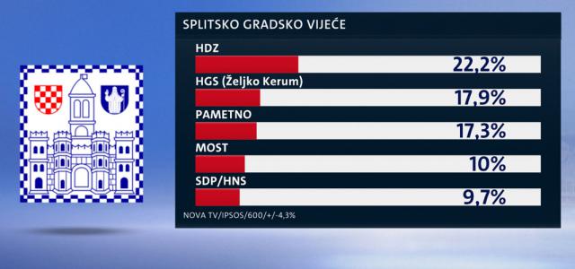 Osim u utrci za gradonačelnika, vodimo i kad su u pitanju liste za splitsko Gradsko vijeće: HDZ osvaja 22,2 posto, Kerumova Hrvatska građanska stranka 17,9 posto, Pametno 17,3 posto, Most bi imao 10, a koalicija SDP-HNS 9,7 posto.